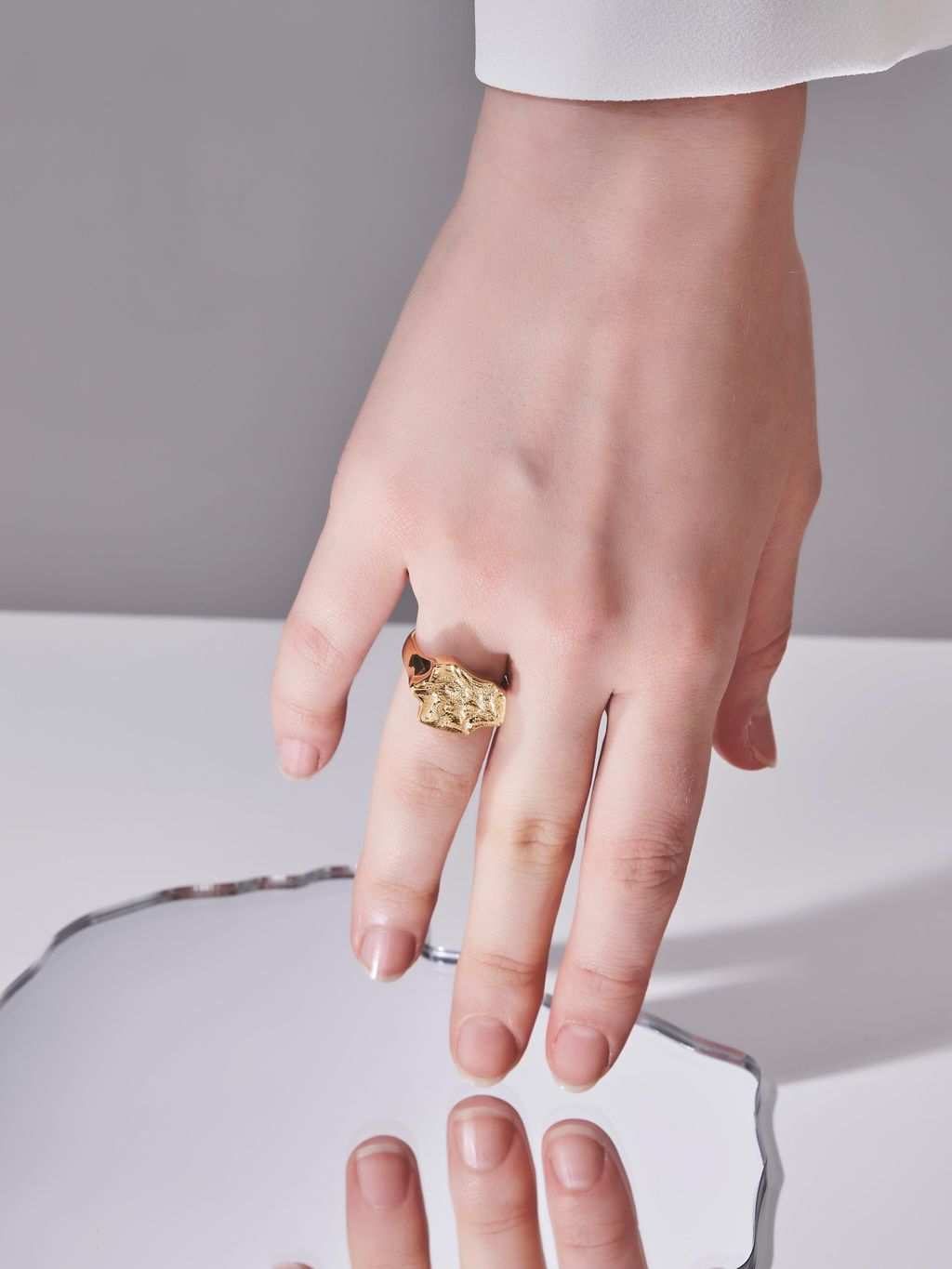 LESIS 經典設計,以純手工研磨技法細膩打造,仿製礦石天然表面紋理,重現大自然獨特的線條與層次。戒身採用立體結構設計,融合側邊流暢曲線,兼具厚度與舒適手感,呈現雕塑般的質感與輪廓。整體以一體成型工藝鑄造,搭配 18K 厚金石設計,低調奢華且極具個性。這款戒指不僅展現獨一無二的匠心工藝,更專為追求與眾不同與時髦風格而打造。